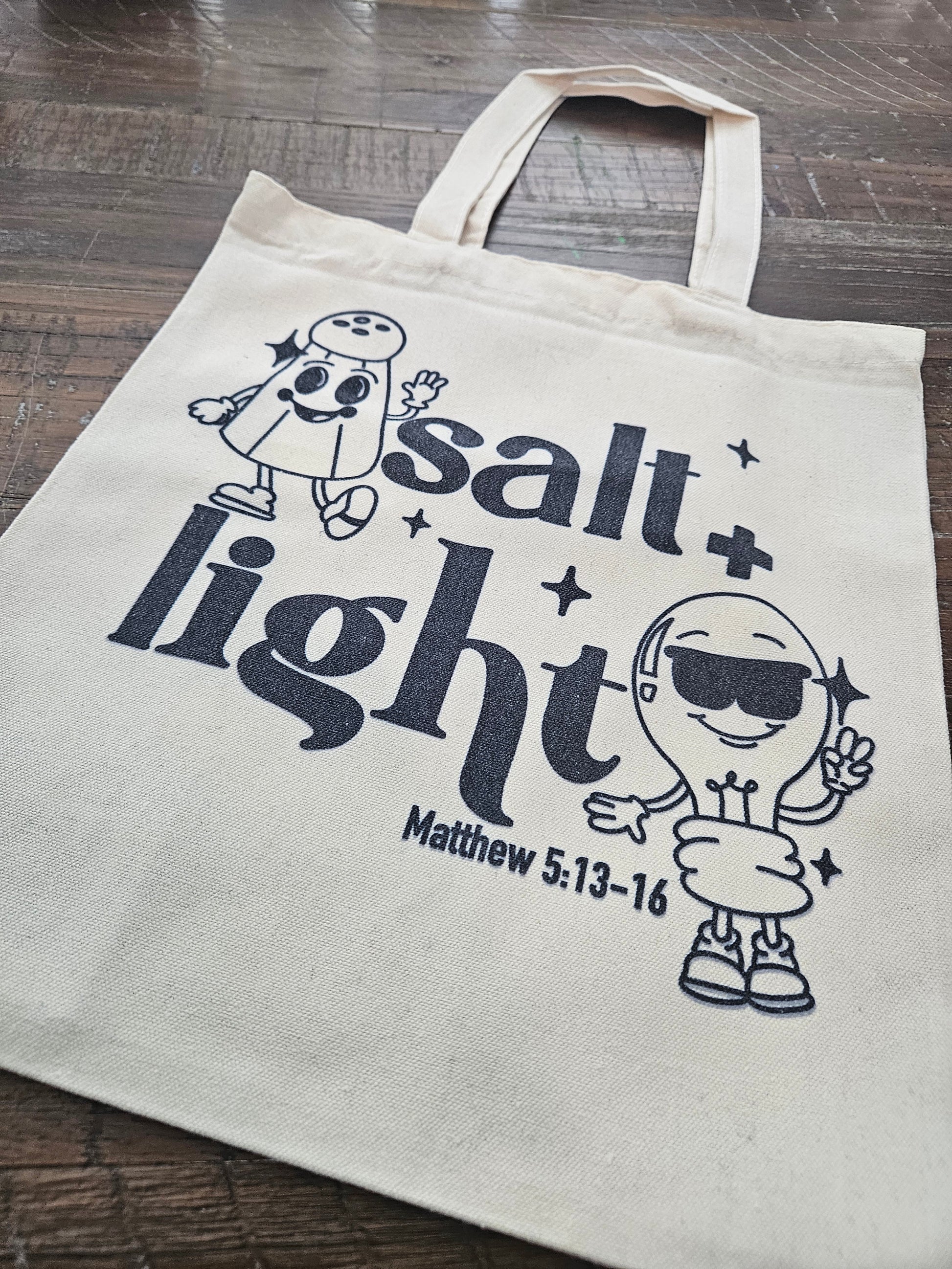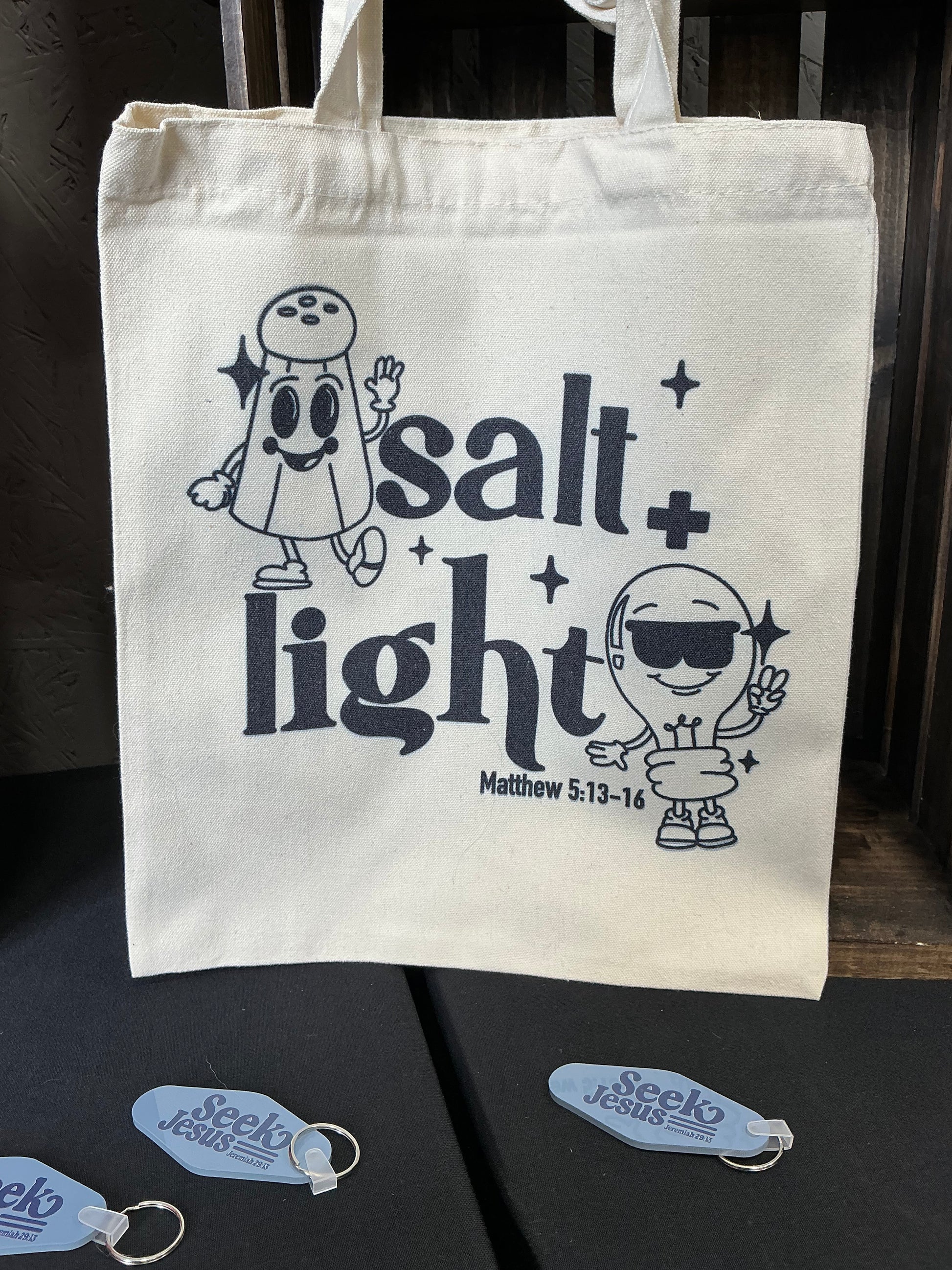 In Matthew it tells us that we are to be "Salt of the Earth" and "Light of the World". As women of faith we are to be the Salt + Light. Let this tote remind your that Jesus has called you to influence the world through Him.