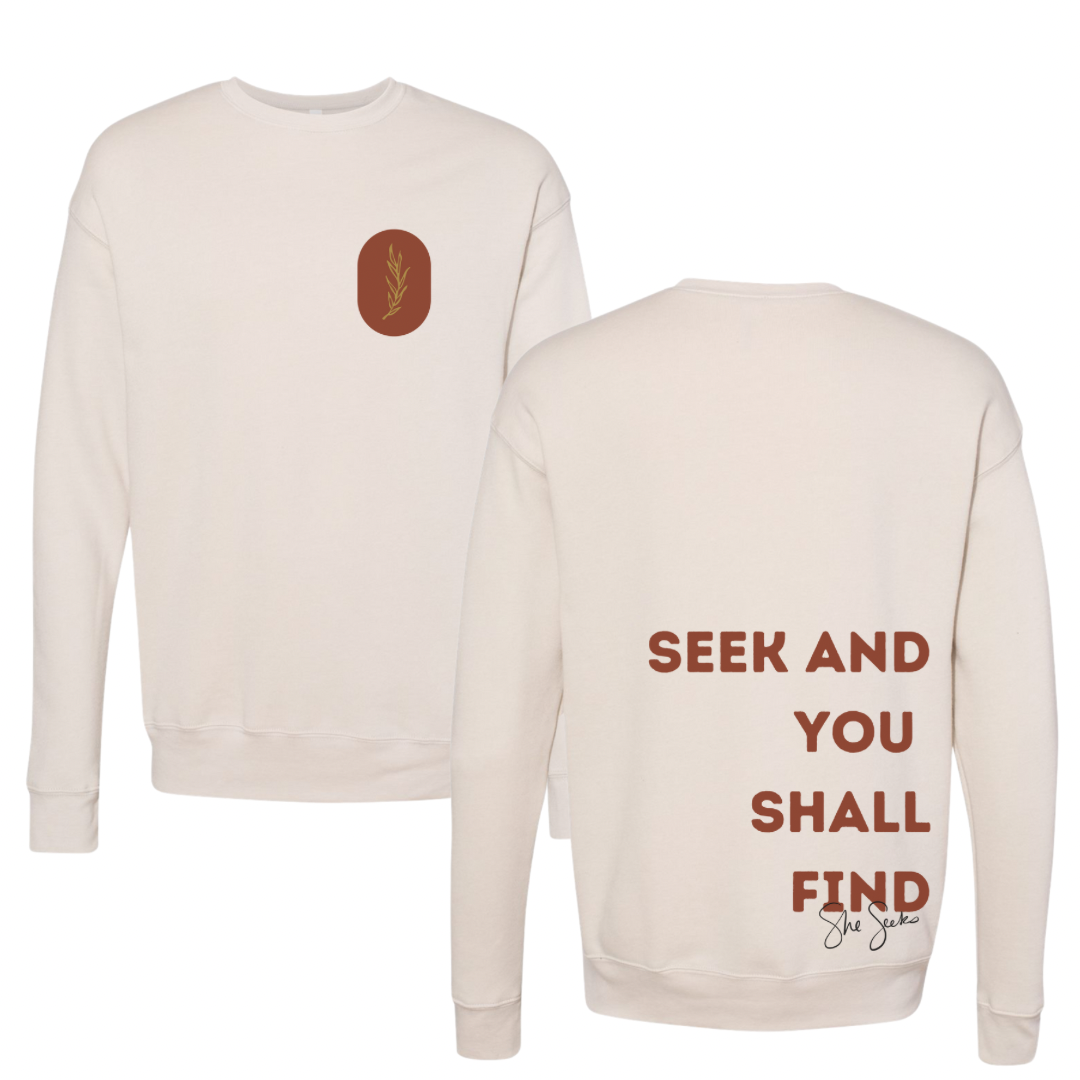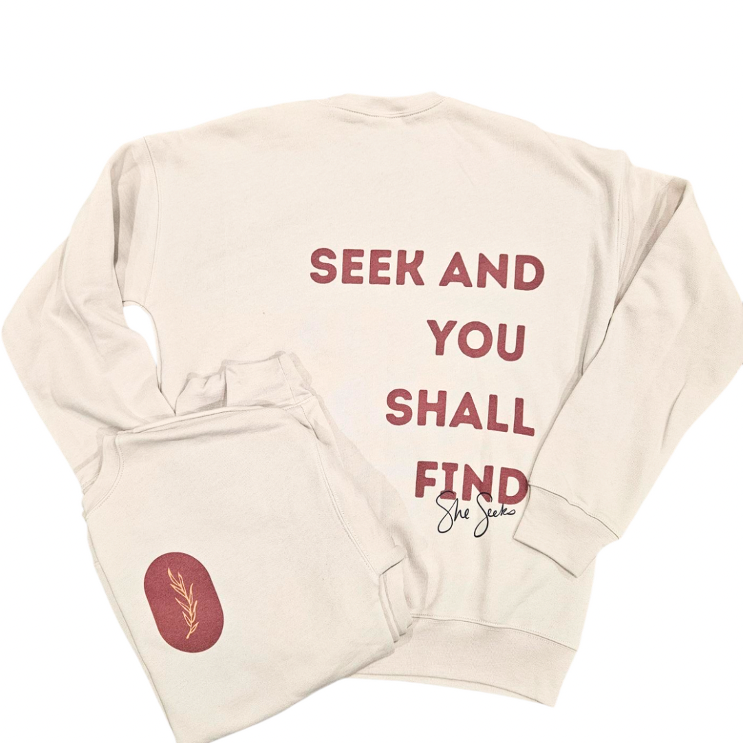 At She Seeks, we seek God in all areas of our lives. Jeremiah 29:13 tells us that is we Seek Him, we will find Him, when we seek Him with all our hearts. Lets this sweatshirt be the statement that you plan to seek God in all that you do and with all your heart.